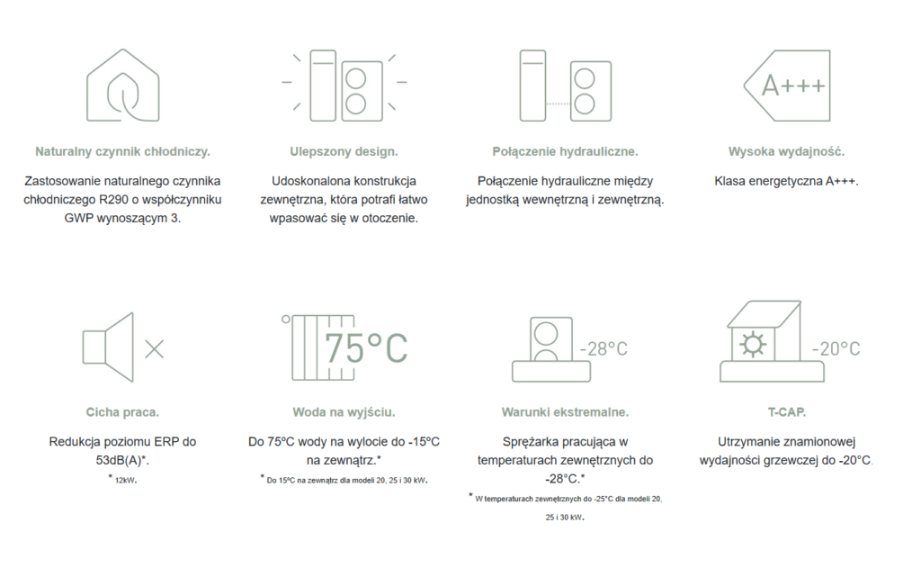 Nowy system wykorzystuje ekologiczny czynnik chłodniczy R290 do ogrzewania, chłodzenia oraz podgrzewania wody użytkowej, minimalizując negatywny wpływ na środowisko. Przeprojektowane jednostki zewnętrzne zapewniają jeszcze lepszą wydajność operacyjną, nawet w ekstremalnie niskich temperaturach.